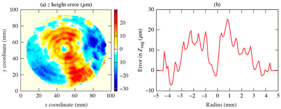(a) Surface profile map of the aspheric x–y surface of one of the fabricated lenses with reference to the ideal designed aspheric surface. (b) Line plot of the surface error along the lens radius.