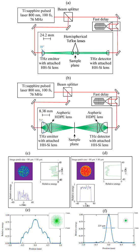 We used 100 fs wide, 800 nm wavelength optical pulses generated by a commercial Ti:Sapphire laser (Coherent, Santa Clara, CA, USA) to excite a low-temperature grown GaAs (LT-GaAs) THz emitter, as well as probe an LT-GaAs detector antenna (TeraVil Ltd., Vilnius, Lithuania). Additionally, both the antennae were equipped with adjustable HH-Si lenses mounted immediately in front of them to collimate the THz beam. We performed our previous experiments by placing a pair of short-focal-length hemispherical TeflonTM lenses to focus the emitted THz beam onto the sample plane and collect the transmitted signal, as presented in Figure 4a [10]. In the present work, a pair of aspheric lenses were designed considering our existing THz-TDS setup in terms of transmission geometry. We then realigned the same setup, replacing the TeflonTM lenses with the aspheric HDPE lenses, as shown in Figure 4b. As shown in Figure 4a,b, the THz rays after passing the HH-Si lenses are somewhat collimated, but there is also a significant number of spherical aberrations, which is a typical signature of the spherical surface. The aspheric lens (Figure 4b) then not only focuses the beam onto a focal point where the sample is placed, but also corrects the spherical aberration caused by the Si lens. (We note that off-axis parabolic mirrors cannot correct for this type of spherical aberration.) After traveling through the sample, a diverged beam is then collected by an identical aspheric lens to be collimated and then focused by the HH-Si lens integrated with the detector. The advantage of using the aspheric HDPE lenses compared to TeflonTM lenses is two-fold. Firstly, the HDPE lenses provide more throughput from the emitter to the detector. In the TeflonTM lens system, we could only collect 16° of the full-angle emission (Figure 4a), whereas using HDPE lenses enabled us to collect 71° full-angle emission (Figure 4b). Also, only 0.12% power is transmitted to the detector while using the TeflonTM lenses, as shown in Figure 4c, whereas 90.82% power is transmitted to the detector using HDPE lenses, as shown in Figure 4d. Secondly, the aspheric HDPE lens system enables a smaller sampling spot size of 200 μm, as shown in Figure 4e, compared to the 600 μm spot size (Figure 4f), using the hemispherical TeflonTM lens system. The inset of Figure 4f shows a spot diagram at the focal point (sample plane) using the aspheric HDPE lens system, indicating a very tightly focused beam with a geometrical root–mean–square (rms) radius of about 225 μm, which is significantly less than the diffraction limit of 565 μm (the black circle). Therefore, the spatial resolution is limited only by diffraction.