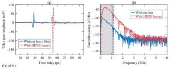To show the advantage of the insertion of HDPE lenses in our THz imaging and sensing setup, we performed comparative studies by measuring THz transients under the same conditions—an empty experimental setup in air environment—using the hemispherical TeflonTM lenses and replacing them with the aspheric HDPE lenses. Figure 5a presents the time-domain waveforms of those signals, while Figure 5b shows their fast Fourier transforms (FFTs). As expected, because of their fine focusing and greater THz power transmission at the detector (see Figure 4b), the signal amplitude in Figure 5a with the HDPE lenses is significantly (about 30×) larger, most importantly, introducing HDPE lenses increased the central frequency from 0.02 to 0.43 THz (see Figure 5b) and the total bandwidth increased from ~2 THz to ~3.5 THz. The 10 dB bandwidth was also slightly enhanced and equal to 1.07 THz (see Figure 5b), causing the fractional bandwidth at the 10 dB figure of merit, defined as the 10 dB bandwidth divided by the central frequency value, to be as small as 2.5. The fractional bandwidth at 10 dB is the measure of the effective bandwidth in the focused region [25].