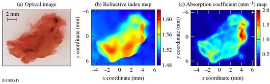 (a) An optical image of a 4 mm FFPE healthy murine tissue used in this study. High-resolution, 2D THz-imaging maps of the same tissue, using (b) the refractive index and (c) the absorption coefficient as imaging markers.