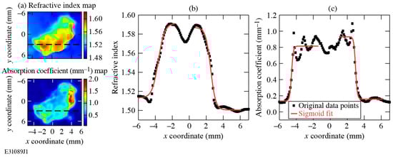 (a) The double-sigmoid fit function was applied to the line scans at y = 3 mm for both the n and α maps shown earlier in Figure 6. (b) Double-sigmoid fit for n. (c) Double-sigmoid fit for α.