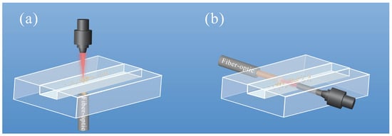 There are two perspectives to classify the fiber-optic sensors on a chip: one is based on the integrated modes on a microchip, and the other is based on its functionality on a microchip. In Figure 2, microchips integrated with fiber-optic sensors are categorized as proximity and embedded modes [27]. The proximity fiber is located close to, but not in direct contact with the microchips (Figure 2a). Though proximity fiber introduces additional noise in the signals, they are easy to assemble on microchips and have been suggested as an economical yet highly sensitive alternative. The embedded fibers allow for optimal performance with minimal signal loss by inserting the fiber into the microchip and ensuring physical contact with the microchannel structure (Figure 2b). However, this integrated mode places higher requirements on the chip processing to ensure a high level of integration between the chip and the fiber.