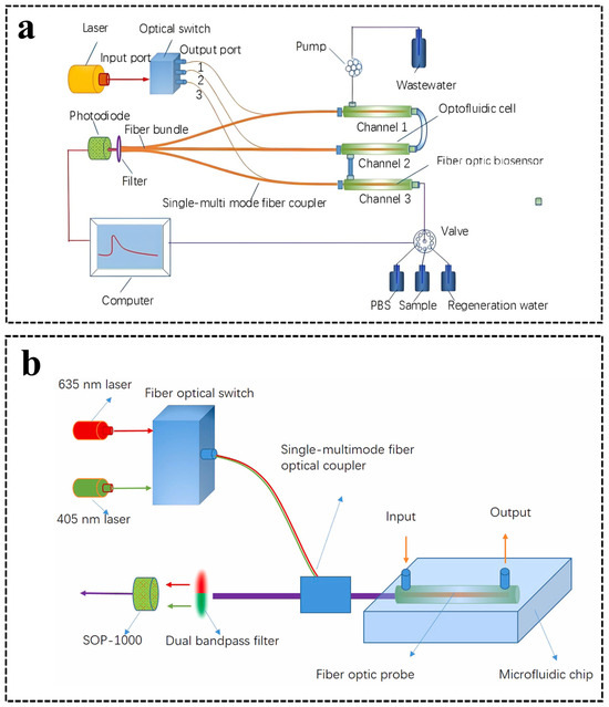 (a) Scheme of the multichannel all-fiber optofluidic biosensing platform system. Reprinted with permission from [72]. Copyright 2018 Elsevier B.V. (b) Scheme of the dual-color total internal reflection fluorescence-detecting platform. Reprinted with permission from [73]. Copyright 2019 Elsevier B.V.
