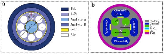 Photonic crystal fibers (PCFs) have become a promising candidate for SPR sensing. taking advantage of their small size, ease of optical emission, single-mode propagation, and ability to control evanescent field penetration [83]. PCFs consist of a core and cladding similar to the traditional fiber-optic sensor, but the cladding region has periodic air holes that manage light propagation. PCFs have the advantage of flexibility in design, whose geometry can be optimized for achieving the optimum evanescent field, such as hexagonal, square, and octagonal. Yao et al. [84] proposed a dual-sample simultaneous detection sensor using an up-fiber core PCF (Figure 7a). The upward-shifted structure of the fiber core enlarged the air holes, and the liquid channels to be tested in the large air holes were favorable for coating a gold film and filling liquid. This structure was without the characteristics of rotational symmetry, which greatly reduced the fiber confinement loss and had a high sensitivity of 8300 nm/RIU. In addition, a novel PCF-SPR sensor with two orthogonally polarized core modes was designed to achieve the simultaneous measurement of the magnetic field and temperature [85]. Four annular microchannels coated with Ag-Ta2O5 films were symmetrically distributed in PCF cladding. In Figure 7b, the upper/lower microchannels had magnetic fluids, and then the temperature-sensitive material penetrated the left/right microchannels. The refractive index of magnetic fluids was strongly dependent on the magnetic field and temperature, while the refractive index of temperature-sensitive materials was only affected by the temperature. Thus, the information on the magnetic field and temperature carried by two orthogonally polarized core modes could be separated. The designed sensors showed a magnetic field sensitivity of 265 pm/Oe and a temperature sensitivity of 1410.7 pm/°C.