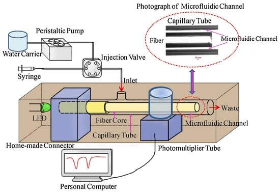 The detection of anions in real water has also been reported. Prawpan et al. [99] developed a microfluidic-based method with front-face fluorometric detection, which was used for measuring inorganic iodine in natural water. The spiral microchannel was used to uniformly blend the As (III)/Ce(IV) reagents and the standard/sample solution. The online reaction of iodate into iodide for detecting the total inorganic iodine in water was performed on a microchip with a channel depth of 500 μm. This channel depth constituted the optical path for fluorescence detection. Front-face fluorometric detection from the fluorescing Ce (III) product was performed at the circular area of the microchip using a fiber that was positioned at the top of the chip and connected to a spectrofluorometer. The developed method, with an LOD of 7.7 μg/L, reached a level of throughput at 20 samples per hour, and is a potential tool for the rapid on-site detection of inorganic iodine in natural drinking water. In addition, a miniaturized sensor based on evanescent wave interaction has been developed for the colorimetric determination of harmful chlorine [100]. This sensor was made by embedding a decladding silica fiber into a transparent columnar tube. An annular microchannel was formed between the optical fiber and the capillary tube, which could be used both as a sample flow cell and a detection cell (Figure 9). The slit diameter (dc = 50 μm) and micro-detection volume (1.2 μL) of the microfluidic channel greatly facilitated the colorimetric interaction of evanescent waves. The sensor was characterized by a small volume consumption (1.2 μL) and fast analysis speed (4.42 s).