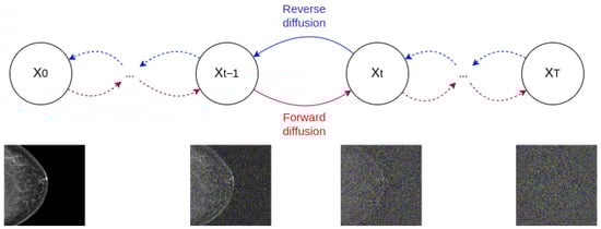 The original diffusion model idea was presented by Sohl-Dickstein et al. [] and consisted of using a Markov chain, a sequence of stochastic events whose time steps depend on the previous one, to gradually convert one known distribution (e.g., Gaussian distribution) into another (target distribution). Inspired by non-equilibrium statistical physics, the main idea is to systematically and iteratively destroy structure in a data distribution through a process called forward diffusion. Then, the reverse diffusion process is learned and used to restore structure in the data. The first practical implementation of the DM premise on images was developed by Ho et al. [] introducing Denoising diffusion probabilistic models (DDPM). In this framework, the data are destroyed by adding Gaussian noise to the image in an iterative fashion described by the Markov chain, as seen in Figure 4. The total number of diffusion timesteps, T, is decided by the user, but a usual number is around . To learn the reverse process, a UNet is used to carry on the denoising process. As such, a DM is built from three fundamental components: a noise scheduler to add noise in the forward process, a UNet to denoise in the reverse process, and a timestep encoder to encode the timestep, t, into the UNet. More information regarding each component is provided in the following sections.