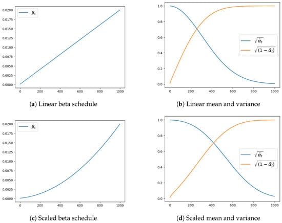 where is the output of the distribution sampling, is the mean, and is the variance of the distribution. Therefore, the sampling of the next noisy version of the image is essentially controlled by , as its value affects both the mean and the variance of the sampling distribution. Selecting the manner in which changes through time is called beta scheduling and is control by the noise scheduler. In Figure 5a,c two examples of beta scheduling are shown.