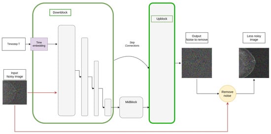 Figure 6 shows the components of the denoising UNet used during the reverse process. It should be noted that the output of the UNet is the noise, , that must be removed from the input image to approximately recover the original image without noise.