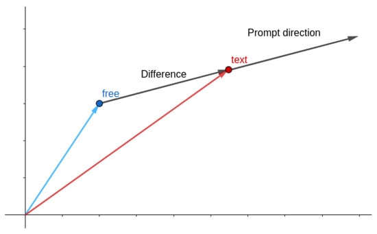 The second hyperparameter is called the guidance scale. Even though the SD architecture uses cross attention in several parts of the network, so that the generation process focuses on the text prompt, in practice the model tends to ignore the text prompt at inference time. To solve this issue, Ho and Salimans [] proposed a technique called classifier-free guidance. In essence, classifier-free guidance consists of generating two noise predictions, , at each step, one using the prompt () and one without it (). Then, the difference between the prompt-generated noise and the free-generated noise is computed. This difference can be considered as a vector in the image distribution space, which points in the direction of the image with text. As such, we can scale this vector and sum it to the free-generated noise to force it to go more in the direction of the prompt text. This geometrical trick is illustrated in Figure 7.