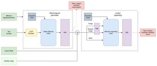 The inpainting task requires mammograms with confirmed lesions only. Using the bounding boxes coordinates available in the metadata, binary masks were generated. Naturally, due to the resizing and cropping preprocessing performed previously, the original coordinates required a proper redefinition using simple geometrical properties. The mask has pixel values of 255 inside the bounding box and zero elsewhere. Because the SD architecture used for the inpainting task requires an input text prompt for the generation, a toy prompt with “a mammogram with a lesion” text was used for all training images.