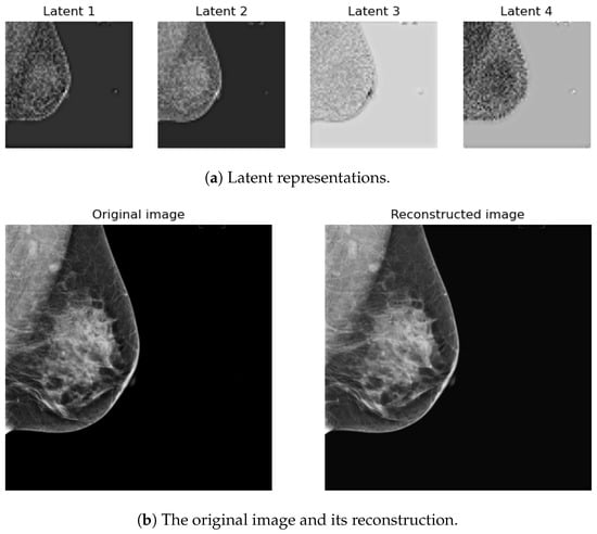 We decided not to fine-tune the VAE encoder and decoder after testing its encoding–decoding performance on our mammograms using pretrained natural image weights, as shown in Figure 9. Moreover, Chambon et al. [] found that a pretrained VAE on natural images can perform well on Chest X-ray images. Using this VAE encoder, an original image of 512 × 512 pixels can be compressed to 4 latent representations of 64 × 64, reducing 16 times its original shape []. Consequently, the diffusion process is performed on the latent representations rather than on the original images, allowing lower memory usage, fewer layers in the UNet, and faster training and generation.