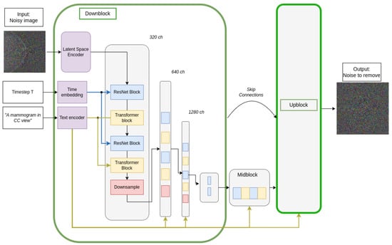 Additionally, in order to use the pretrained weights available for SD, the images were resized to a 512 × 512 square using bilineal interpolation and center cropping, as shown in Figure 2. Images with right laterality were horizontally flipped so that all images had the breast region on the same side.