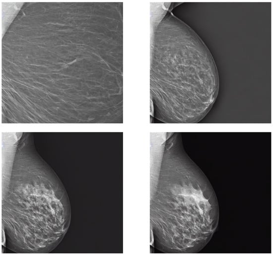 For each healthy mammogram, a text prompt description was created and saved along with the image ID in a JSON file. In the case of the OMI-H dataset, we created a prompt with the image view and breast area size information. To compute the breast area size, we first obtained a breast mask using the intensity information of the image and then applied a threshold to separate background and breast tissue. Later, the ratio of pixels in the mask compared with the total image was computed and criteria for three different breast area sizes was defined, as shown in Table 2. For the VinDr dataset, the breast density information was included instead of the breast area for the prompt description. Breast density was available in BI-RADS scale, so we needed to transform this information into a semantically meaningful text following the criteria in Table 2, based on the BI-RADS breast density descriptions []. Examples of the text–image training samples can be found in Figure 3.