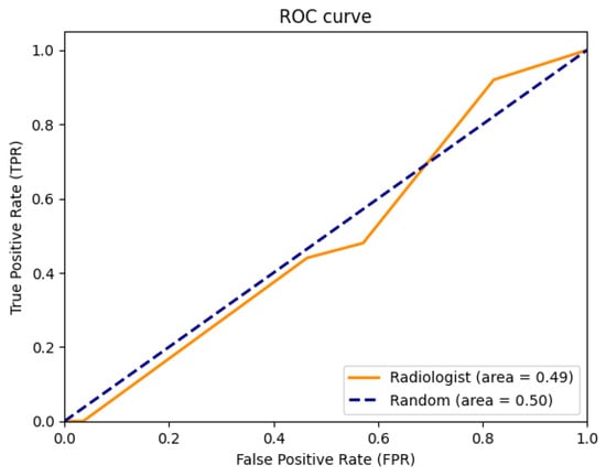 Visual assessment was performed with the radiological evaluation of 53 synthetic images by a radiologist. The experiment consisted of asking a radiologist with 30 years of experience to rate the mammograms on a scale of 0–4, where 0 means definitely synthetic image, 1 probably synthetic, 2 unsure, 3 probably real, and 4 definitely real image. The distribution of the mammograms had a 50/50 real–synthetic ratio. The results of the test are summarized as an ROC curve in Figure 17. The shape of the ROC curve bears resemblance to the random guess curve, suggesting that the radiologists cannot easily identify the difference between real and synthetic images. Moreover, the AUROC value obtained by the radiologist for this synthetic classification task was 0.49.