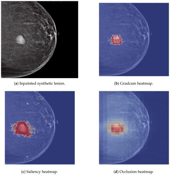 Initial results of the lesion generation pipeline show the possibility to inpaint mass-like lesions in any part of the mammogram. Visually, the lesions generated have a realistic appearance, although no radiological evaluation was carried out. As a preliminary experiment, we showed healthy Hologic mammograms with inpainted synthetic lesions to an in-house lesion classification CAD system trained with full field real Hologic mammograms containing masses and normal lesions. The heatmaps of three Explainability AI (XAI) methods were computed for those mammograms. The XAI interpretation methods applied were gradcam, saliency, and occlusion, and their respective heatmaps can be seen in Figure 18. The hypothesis is that when a synthetic mammogram is used as input the algorithm should highlight the synthetic lesion area, indicating that synthetic lesions have a similar pixel distribution to those present in real images.