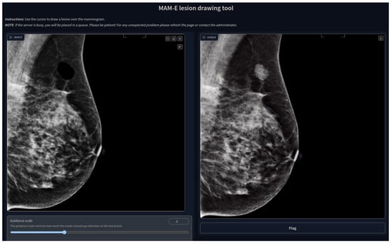 In the case of the inpainting task, the GUI has the option to upload the image that will be inpainted, although a default image is available. An interactive drawing brush is then activated, with which a lesion can be inpainted in any part of the mammogram, as shown in Figure 19.