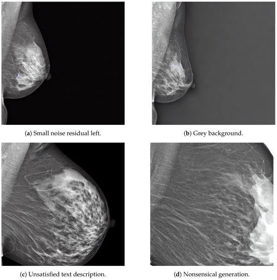 Examples of unsuccessful image generation of the combined dataset models coming from the same text prompt. The prompt was “A siemens mammogram in MLO view with small area and very high density” with a guidance scale of 4.