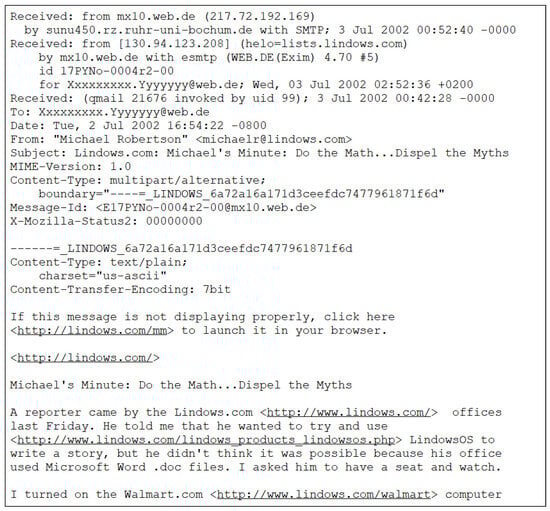 The emails in the dataset are in email archive storage format, containing HTML tags, email header information, encoded images and files, text, and URLs. Figure 2 shows an example of an email message in the general format of the dataset. During preprocessing, the subject and body of the email were extracted, eliminating HTML tags, punctuation, encoded attachments, images, unnecessary spaces, IP addresses, email addresses, and stop words. Finally, URLs starting with http were replaced with [http].