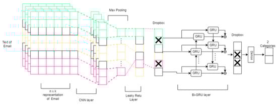- Remmide, M.A.; Boumahdi, F.; Boustia, N. Phishing Email detection using Bi-GRU-CNN model. In International Conference on Applied Cybersecurity; Springer: Cham, Switzerland, 2021; pp. 71–77. [Google Scholar]