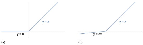 Leaky ReLU layer: The Leaky ReLU layer with leak correction is a variation on the classic ReLU activation function. The function’s output has a small gradient toward the negative input. The main difference between the Leaky ReLU and classical ReLU is shown in Figure 5: the Leaky ReLU can be a negative value instead of a zero value, as shown in Equation (2).