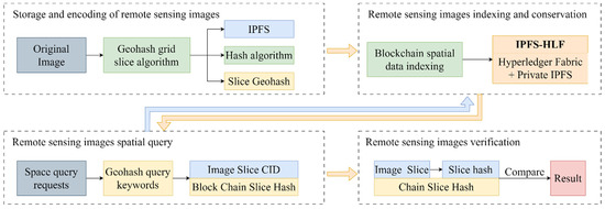 Applying blockchain technology to the protection of remote sensing images is challenging due to the significant storage pressure it creates, as each node stores a complete data set [5]. To alleviate this, most blockchain networks control the size of the data being added [6]. Addressing both storage and efficient retrieval issues is crucial for integrating blockchain with remote sensing image protection [7]. This study introduces a blockchain-based method for remote sensing image retrieval verification. By combining the IPFS file system with Hyperledger Fabric (HLF) blockchain, it leverages IPFS’s decentralized storage to distribute the storage burden and improve data access efficiency. Additionally, the method employs Geohash spatial filling curves to optimize the spatial data representation of remote sensing images. This, combined with LSM trees, creates an efficient spatial data indexing system, enabling effective spatial data queries on the blockchain.