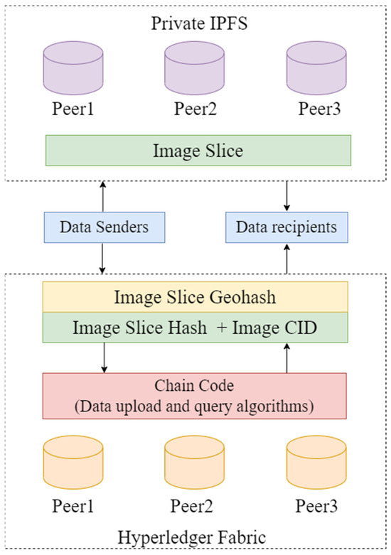 Hyperledger Fabric, an open-source, permissioned enterprise blockchain platform [19], offers a highly customizable, secure, and modular architecture suitable for a variety of industry applications. It uses chaincode to manage the business logic of interactions within the blockchain network. In this research, to alleviate storage pressure on Hyperledger Fabric, remote sensing image data is not stored directly in it. Instead, a private IPFS network serves as an auxiliary off-chain storage unit, storing only the hash values of images and their addresses in the IPFS system. This ensures data immutability and increases storage efficiency. IPFS, a secure and efficient distributed storage and transfer protocol, uses content-addressing to build a hash-verified storage system. Combining IPFS with Hyperledger Fabric has proven more efficient, suitable for various data storage scenarios [20,21]. Remote sensing images stored in the private IPFS network are accessed uniquely via generated Content Identifiers (CIDs), which also enter the on-chain notarization process.