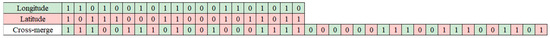 The merging of the codes is accomplished by alternately merging the binary strings of longitude and latitude, resulting in a new binary string. Figure 6 demonstrates the process of merging these binary strings. The newly generated binary string fully integrates longitude and latitude information, ensuring that adjacent geographical locations also have similar prefixes in their encoding.