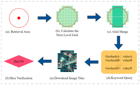 This method initially calculates all Geohash grids within the entire search range, based on the divided levels of remote sensing image slices. As shown in Figure 8c, an optimization strategy is employed to reduce query requests and enhance efficiency. The algorithm checks if the query area includes complete parent grids. If so, it uses the parent grids’ Geohash codes for queries instead of numerous child grid codes. This optimization reduces the number of requests while maintaining result completeness. After retrieving results, the algorithm downloads images from the storage address and compares their SHA256 hash summary with the on-chain hash to verify the images’ authenticity and integrity.