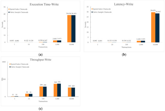 Comparison of chaincode write performance. (a) Comparison of execution time for writing data between spatial index chaincode and sample chaincode; (b) Comparison of latency for writing data between spatial index chaincode and sample chaincode; (c) Comparison of throughput for writing data between spatial index chaincode and sample chaincode.