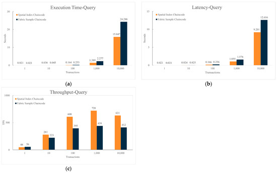 Comparison of chaincode query performance. (a) Comparison of execution time for spatial data queries between spatial index chaincode and sample chaincode; (b) Comparison of latency for spatial data queries between spatial index chaincode and sample chaincode; (c) Comparison of throughput for spatial data queries between spatial index chaincode and sample chaincode.