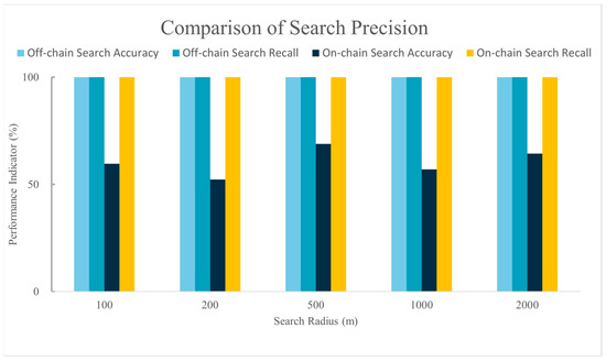 Figure 11 displays a comparison of retrieval accuracy between the on-chain spatial data query method proposed in this study and the off-chain spatial data query method introduced by Yi Bao [28] under different search radii. Compared to the off-chain query method proposed by Yi Bao and colleagues, the recall rate of our method matches that of the off-chain method, being able to retrieve all data that meet the criteria. However, there is still a gap in retrieval accuracy compared to the off-chain query method.