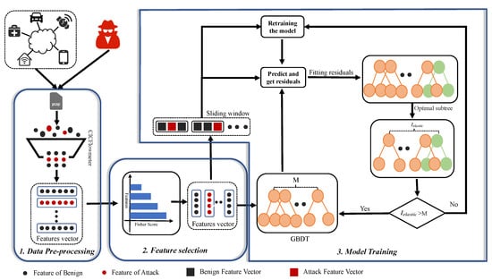 In this section, we propose a GBDT-IL-based method for detecting IoT botnet traffic. It consists of three main components: data preprocessing, feature selection, and model training. Figure 1 shows the framework of GBDT-IL.