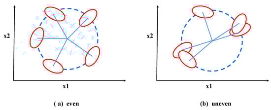 From Formula (2), the value of the interclass variance of the Fisher Score is obtained by re-summing the squared difference between the mean of all samples in a class under the feature and the mean of all samples in the class. However, when faced with samples on a circle with a fixed radius centered at the class centroid, as shown in Figure 2, the calculated interclass variance of the features using Formula (2) for both Figure 2a,b is the same. This clearly contradicts the actual situation. Although these samples belong to the same class centroid, and the distances from the five classes to their respective centroids are the same, the positions of the class centroids themselves are different. Therefore, the traditional Fisher Score method is unable to measure this interclass difference accurately.