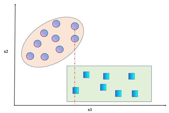 To address this issue, Song et al. [30] proposed an improvement to the interclass variance formula in the Fisher Score. They modified it to be the squared difference between the average value of all samples in a certain class and the average value of samples from all other classes, as shown in Equation (5). Although this method can capture the interclass differences illustrated in Figure 2, it does not consider cases where there is an overlap in the number of samples between two classes for certain features. For example, as shown in Figure 3, when there is an overlap in a certain feature between two classes, indicated by the dashed line, the values of both classes are identical for feature . Therefore, taking into account the overlap among the data, we address the situation of overlapping features by introducing the cross-correlation coefficient [31]. We propose an optimized Fisher Score (NFS) method to further optimize the interclass variance. The formula for the crossover coefficient is given by Equation (6). In this equation, represents the number of data points that have the same value for categories p and q under feature i. This value is obtained by subtracting the overlapping data to distinguish the overlapping features. If there are more overlapping data, it means that it is more difficult to distinguish the two types of data using the feature. Additionally, when there is a higher amount of overlapping data, the crossover coefficient decreases, indicating a smaller interclass variance and implying that the feature poses greater difficulty in distinguishing between the classes. Therefore, combining the above two shortcomings of the existing interclass variance calculation formula, the final interclass variance is modified to Formula (7). Correspondingly, the new Fisher Score for the kth feature on the dataset is defined as , and its calculation is given by Equation (8).