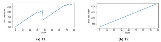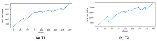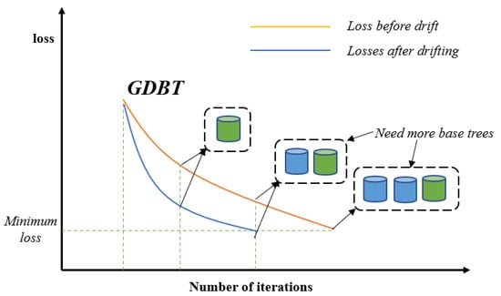 In the GBDT-IL algorithm, the initial number of trees M is used as the drift threshold. If , it triggers the retraining process. Additionally, as the model adapts to new concepts through incremental learning, the number of subtrees in the GBDT model is expected to increase with the progression of the data stream. If it is observed that the total number of trees in the model, after pruning, is still less than the number of trees trained on the initial window, it indicates that the existing model cannot adapt to the new data in the data stream. In such cases, the GBDT model is retrained on the new sliding window, and the drift threshold is updated to M, representing the number of trees in the retrained GBDT model.