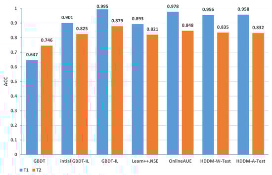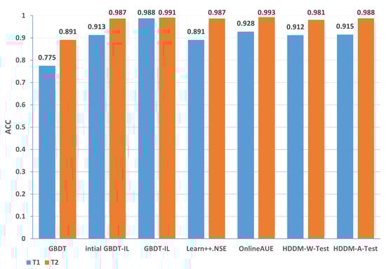 (4) Combined with analysis (3), we can see that the performance of GBDT-IL is not significantly improved compared with the intial GBDT-IL model at drift type 1-T2. Combined with the experimental results in Figure 9 we can find that the GBDT-IL model at 1-T2 does not trigger the process of pruning the GBDT tree or model retraining, but only keeps increasing the number of GBDT subtrees. In this case, the model performance is not significantly different from the pure incremental learning model of initial GBDT-IL.