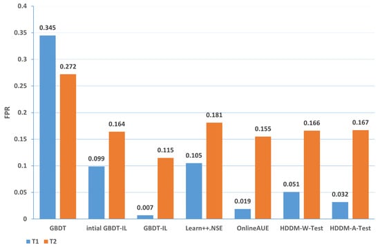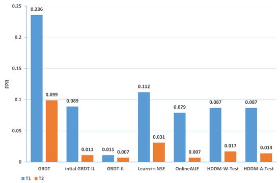 Mixing the above two cases and the conceptual drift of data distribution changes: the comparison of different algorithms in terms of accuracy and false positive rates for concept drift types T1 and T2 of type 3 are shown in Figure 13 and Figure 14, respectively. It can be observed that the GBDT-IL algorithm achieves the highest classification accuracy and lowest false positive rates for both concept drift types T1 and T2 of type 3. This indicates that GBDT-IL is capable of adapting to different types of concept drift and performs remarkably well.