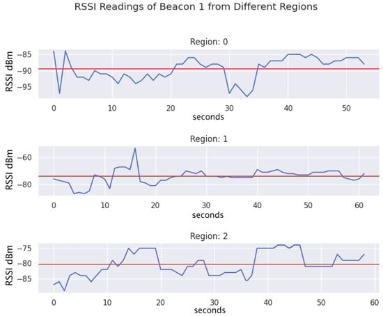 Example of RSSI readings of Beacon 1 while in different regions of the testing area. The mean is indicated as a red solid line and the RSSI signal as a fluctuating blue line.