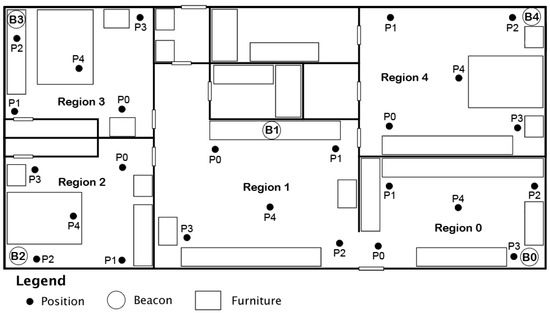 We performed this experiment first using five BLE beacons across five regions and then again with three BLE beacons across three regions. The placement of beacons in the first experiment can be seen in Figure 2, with Beacons 0–4. The placement of beacons in the second test is the same as the first but only uses Beacons 0–2.