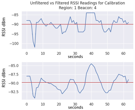 The moving average filter is an important step in our approach as it is a simple means of reducing the amount of fluctuation in the RSSI readings as they are collected by the Android application. Figure 4 displays a sample of collected RSSI data for Beacon 4 while the user is in Region 1. The top graph displays the unfiltered data, while the bottom graph displays the simple moving average filter with a window size of 2. The red horizontal line indicates the mean values.