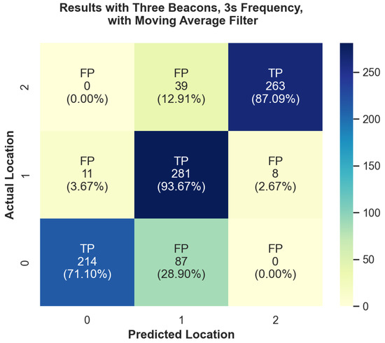 Heatmap plot of the accuracy of predicted room locations versus actual room locations for experiment with three beacons at 3-s aggregation with moving average filter.