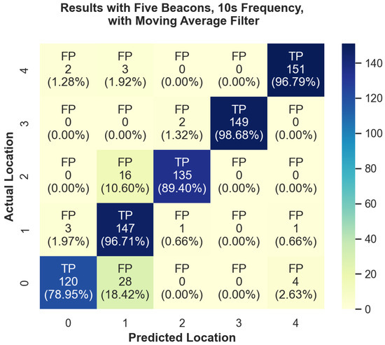 In addition to the overall performance, we have also looked at the performance for each individual region in each of the experiments. We can see a visual overview of some of these results in Figure 5 and Figure 6. In these heatmap plots, the color bar on the right side indicates the color associated with the number of positive readings. Diagonal cells of the heatmap are true positives (TPs) and all other cells are false positives (FPs). A true positive indicates that it correctly predicted that location to be the current location. Under the FP or TP designation is the total number of predictions for that location, followed by the percent that represents samples for that location (row). For example, in the top row, Region 4, each box on that row shows how often it predicted the user to be in Regions 0–1 while standing in region 4. At position (4,4) we can see that there was a TP rate of 96.79% accuracy. Figure 5 demonstrates our experiment run with the worst overall performance. This figure displays the number of true-positive and false-positive readings for each actual location. The overall accuracy for this test was 83.778%; however, we can see that in Region 1 there was a 93.67% true-positive rate. This discrepancy can also be seen in our best performance, with five beacons and ten-second aggregation, which can be seen in Figure 6. The overall average was 92.106%; however, we were able to achieve 98.68% accuracy in Region 3.
