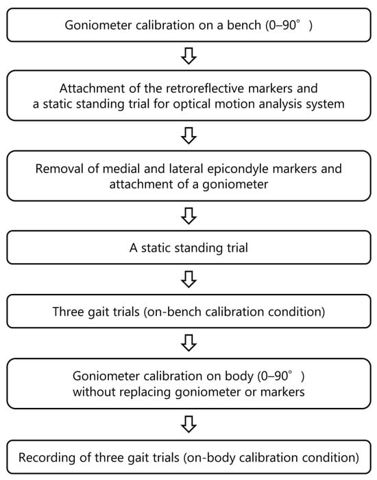 Retroreflective markers were attached to the pelvis and lower extremities based on a previous study []. Markers were placed on the iliac crest, anterior and posterior superior iliac spines, greater trochanters, medial and lateral femoral epicondyles, medial and lateral malleoli, second metatarsal head and base, and fifth metatarsal head and heel. In addition, thigh and shank marker clusters were attached to the lateral aspect. The greater trochanter marker was only used to align the goniometer with the lower extremity axis and was not used for three-dimensional motion analysis. The lateral femoral epicondyle markers were removed after recording the static standing trial to avoid interference with the goniometer. The medial femoral epicondyle markers were also removed because of contact on both sides during gait. Thigh and shank motions during gait trials were tracked using thigh and shank marker clusters.