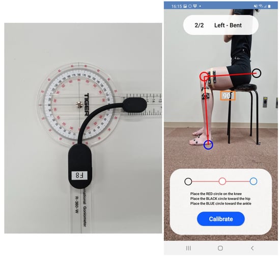 The wearable goniometer sensor (Smart Knee, Nitto Denko Corporation, Osaka, Japan) used in this study has a single axis and is based on a flexible bending sensor system. This goniometer is designed to monitor knee flexion motion during daily living activities such as gait. It weighs 37.4 g and is capable of approximately 6-day measurements with a button battery (CR2450, 260 mAh). The repeatability and output resolution of the goniometer sensor are less than 1.0° and 0.1°, respectively. Our previous study showed a high test–retest reliability for the assessment of knee extension/flexion motion during gait []. The coefficient of multiple correlations (CMC) was 0.988, and the average absolute error (AE) during the entire gait cycle was 2.5°, indicating a good to acceptable error [,]. The intraclass correlation coefficients (ICC) of peak knee extension/flexion angles were 0.880–0.927, indicating excellent reliability, except for peak knee flexion during the swing phase (ICC = 0.713, good reliability) []. The goniometer was attached to the thigh and shank marker clusters on the lateral aspect of the left knee using double-sided tape so that the center of the goniometer was aligned with the lateral femoral epicondyle, frequently referred to as the knee extension/flexion axis []. An experienced physiotherapist palpated bony landmarks (greater trochanter, lateral femoral epicondyle, and lateral malleoli) to align the goniometer with the lower extremity axis. Additionally, elastic taping was used to secure the goniometer to the thigh and shank to prevent rotation. The wearable goniometer was operated using a customized mobile application (SK App, Nitto Denko Corporation) via Bluetooth connection. The goniometer sensor was calibrated to two positions (knee in extended and flexed positions). Using the mobile application, a photograph was taken of each calibration position, and the knee flexion angle was measured on the application (Figure 2). In the present study, two calibration positions were set at 0° and 90° for both on-bench and on-body calibrations. A single examiner (an experienced physiotherapist) confirmed the knee flexion angles of 0° and 90° using a universal goniometer and registered them on the mobile application. The knee flexion angles during the gait trials were calculated by the mobile application using a linear fitting coefficient obtained from the two calibration positions (i.e., 0° and 90°). The sampling rate of the goniometer sensor was set at 200 Hz. A fourth-order Butterworth lowpass filter with a 6 Hz cut-off frequency was used to smooth the data at post-processing using MATLAB (MathWorks, Natick, MA, USA).