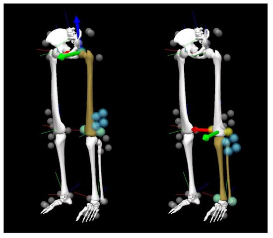 Thigh (left) and shank (right) segment coordinate systems in the optical motion analysis systems. The red, green, and blue axes indicate X-, Y-, and Z-axes, respectively.