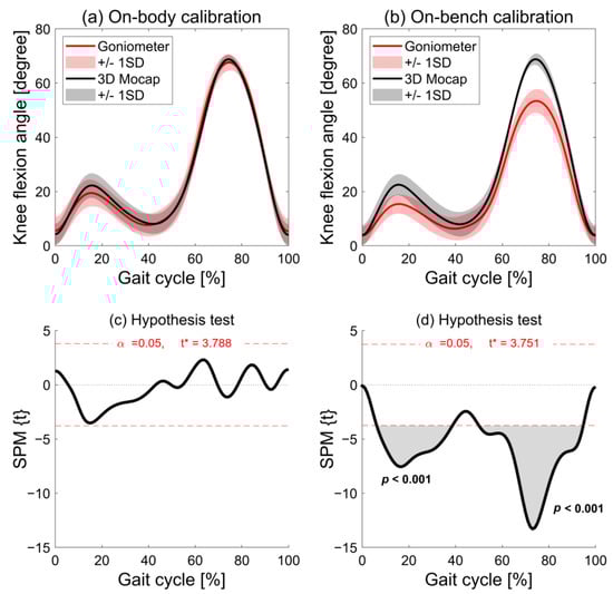 Comparison of knee flexion angles during a gait cycle acquired by three-dimensional motion analysis and wearable goniometer sensor with on-body calibration (a) and with on-bench calibration (b). The results of a statistical parametric mapping (SPM) paired t-test comparing the results of three-dimensional motion analysis and wearable goniometer sensor with on-body calibration (c) and with on-bench calibration (d). Red dashed lines in (c,d) indicate significant differences at p < 0.05. * indicates thresholds of significant difference.