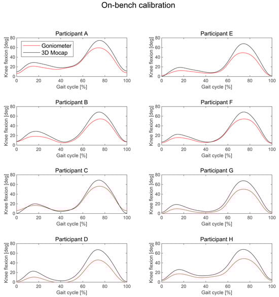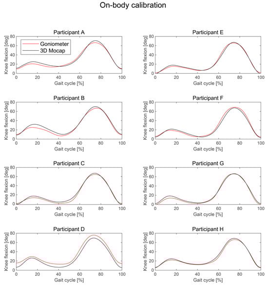Comparison of knee flexion angles during a gait cycle acquired by three-dimensional motion analysis and wearable goniometer sensor with on-bench calibration for each participant.