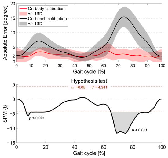 Additionally, AE was compared between the on-bench and on-body calibration conditions using a one-dimensional SPM paired t-test. All statistical analyses were performed using MATLAB. The statistical significance level was set at p < 0.05.