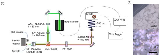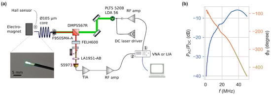 The optical and electrical setup for frequency domain measurements is depicted in Figure 3a. A laser diode (PLT5 520B, ams-OSRAM AG, Premstaetten, Austria) is driven by a constant current source based on a laser driver integrated circuit (NZN, iC-Haus GmbH, Bodenheim, Germany). Additionally, it is modulated by an AC-coupled radio frequency (RF) amplifier (, 1–700, ) at an input power of . The excitation light is collimated, propagates through a dichroic beam splitter (DMPS567R, Thorlabs, Newton, NJ, USA), and is coupled to a core diameter fibre. The end facet of the fiber is coated with NV-rich diamond powder in glue, with crystal sizes much smaller than the facet diameter. The material is comparable in NV density to the material used in [6]. The fiber sensor was manufactured by Quantum Technologies GmbH in collaboration with the Leibniz Institute of Surface Engineering. The fluorescence is collected through the same fiber, passing through a long-pass filter and focused (FELH600 & LA1951-AB, Thorlabs, Newton, NJ, USA) onto a Si-photodiode (S5973, Hamamatsu Photonics K.K., Hamamatsu City, Japan). The photodiode is part of a trans-impedance amplifier (TIA) based on an OPA847 operational amplifier (, ). Its output is passed through a low-noise RF amplifier (, 0.1–2000) to a PicoVNA 106 vector network analyzer (VNA) (Pico Technology, St Neots, United Kingdom) or HF2LI lock-in amplifier (LIA) (Zurich Instruments AG, Zurich, Switzerland), which also drives the laser diode modulation. An electromagnet, connected to a PC-controlled power supply, is being monitored by a Hall effect sensor and enables the application of magnetic flux densities from 0 to ~.
