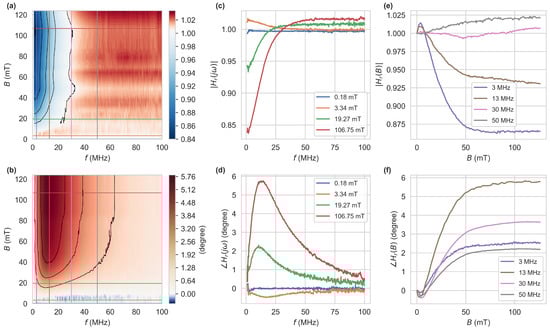 Figure 4a,b show the magnitude and phase of the fluorescence signal as a function of modulation frequency and applied magnetic field (acquired with the VNA), relative to . The horizontal and vertical lines correspond to the other measurements shown in the figure. On the left edge at near zero frequency, we see a relative magnetic contrast of 16% in magnitude, which has already been observed and used for all-optical magnetometry [6,38]. At higher modulation frequencies, this behavior changes significantly. The magnitude for all declines, and a response of the phase to magnetic fields emerges. The phase displays a maximum in magnetic contrast of at . Towards higher modulation frequencies, both quantities decrease in magnetic contrast, and the magnitude rises above one at an inflection point around . At this frequency, the magnitude is nearly independent of the magnetic field (cf. pink trace in Figure 4e) while the phase still shows a magnetic contrast of . This could potentially be used to calibrate the optical path. At lower optical excitation powers, we observe a similar behavior with the difference of a lower signal-to-noise ratio and a decrease in magnetic contrast of both measurement quantities. Many fiber sensors were produced and show good reproducibility in fluorescence intensity and response to static magnetic fields, but lifetime measurements were only performed for one fiber. We also expect lifetime measurement results to be similar for different fiber sensors.